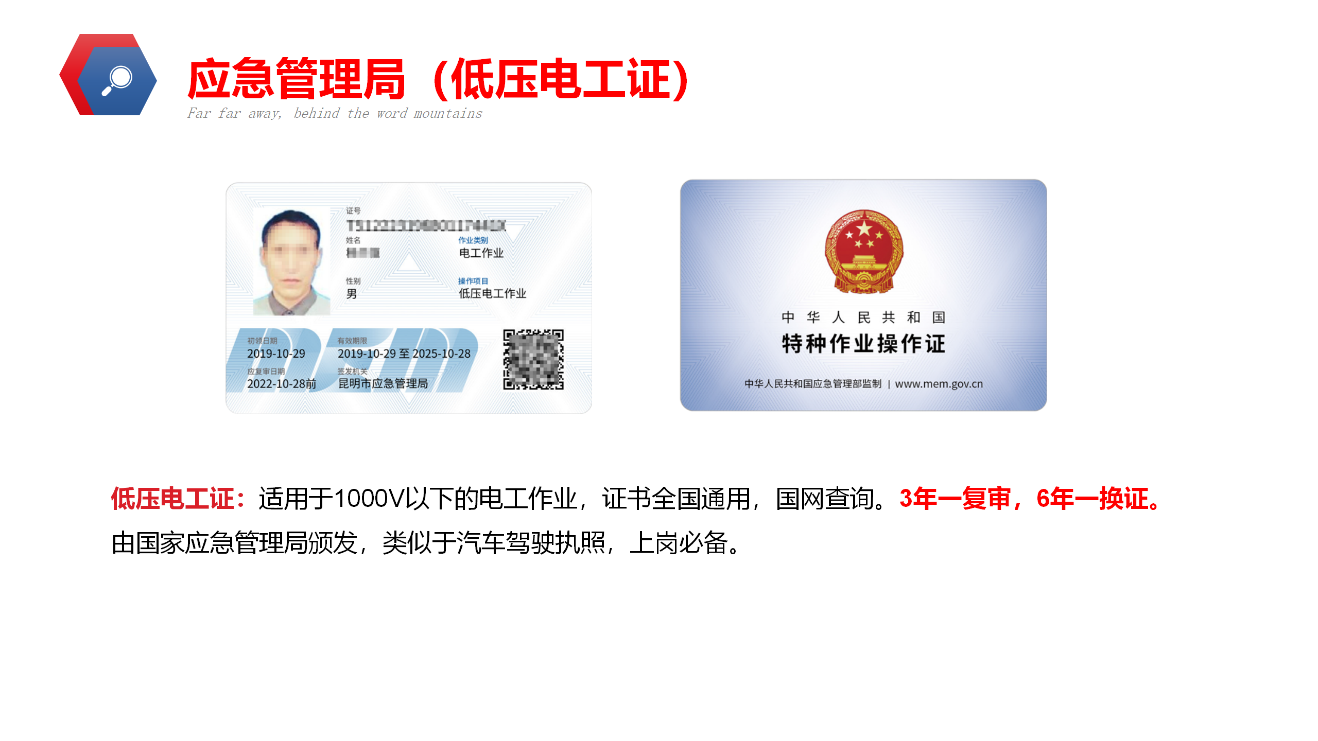 低压电工作业证是一种由应急管理局颁发的证件,是从事低压电工作业人员上岗作业的必备证件(持证的学员需要注意低压电工证3年需要复审一次,未按期复审会导致证书过期作废)考证咨询:18487374709(微信同号)